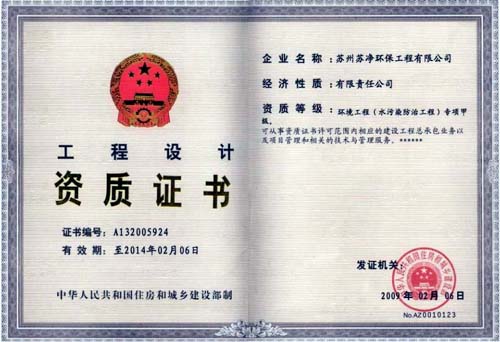 苏净环保:荣获部级专项甲级设计资质